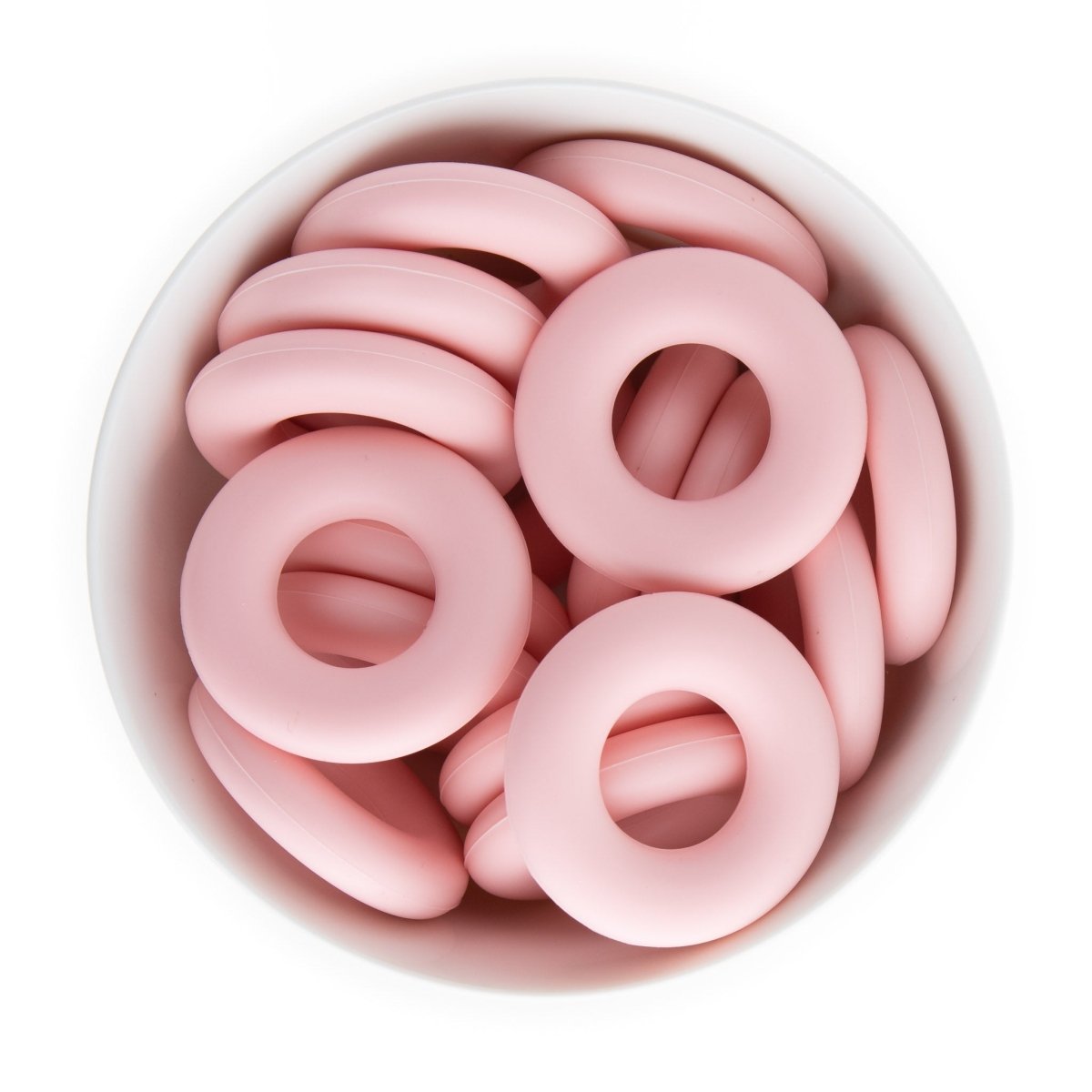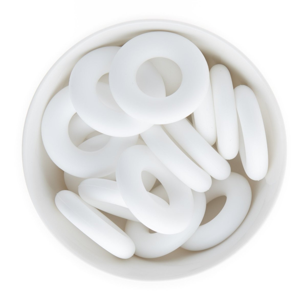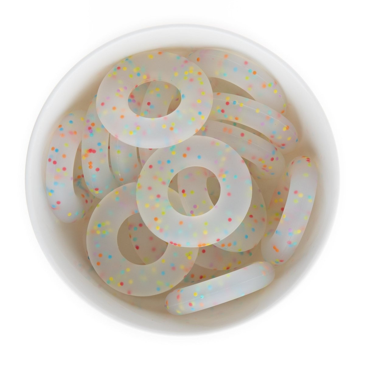 Silicone donut (doughnut) rings/pendants are 44mm in diameter and come in over 20+ colors including tie dye and confetti.