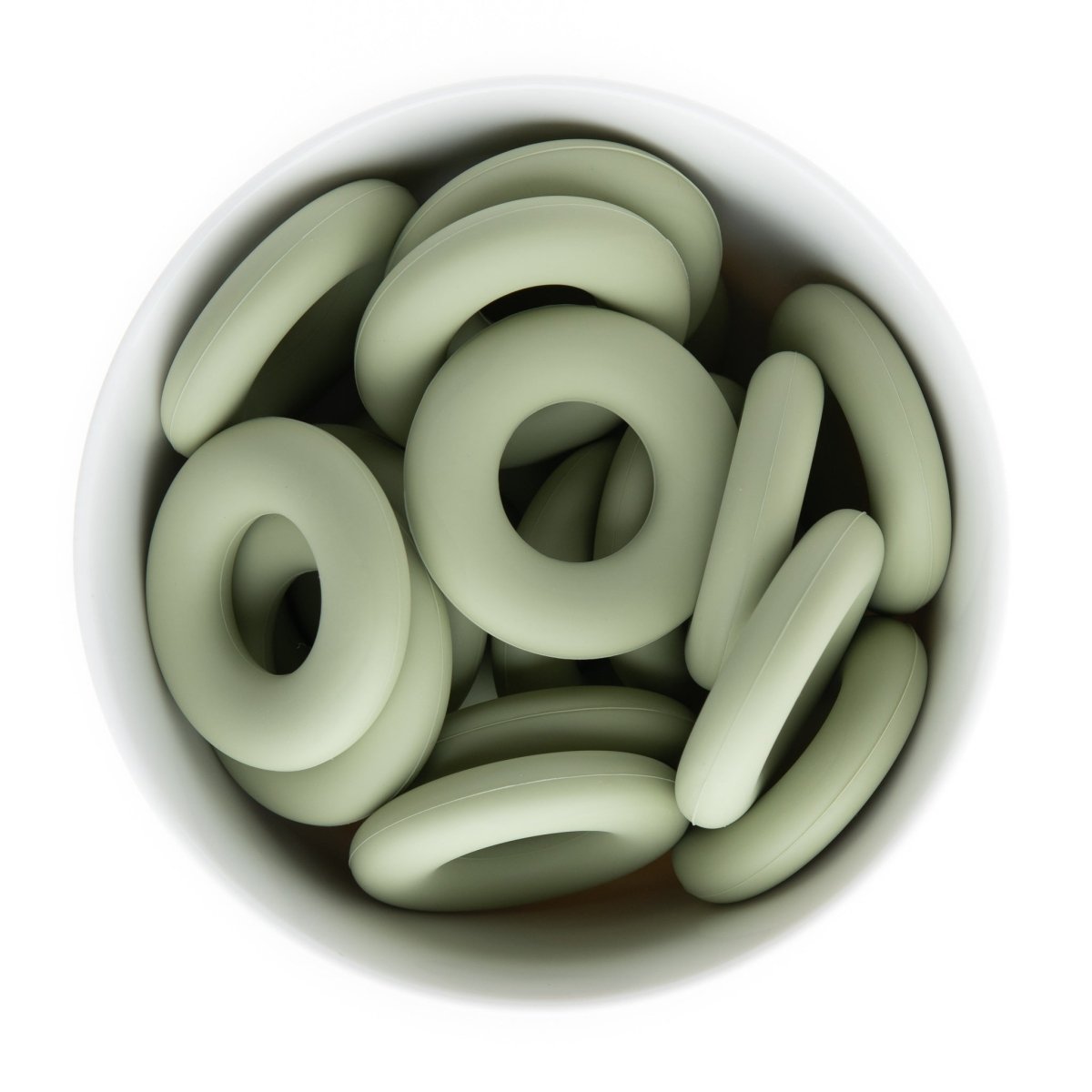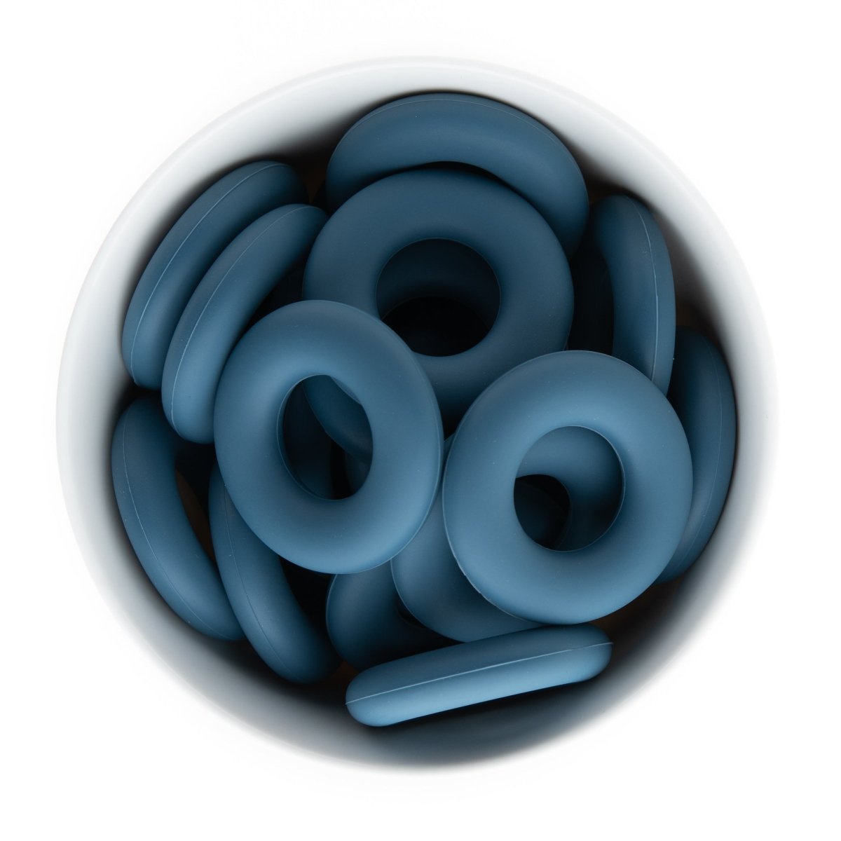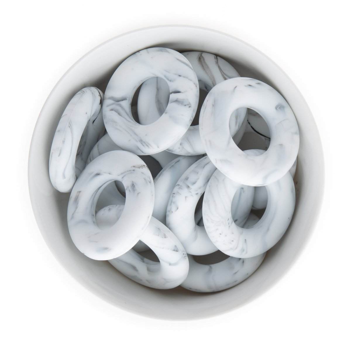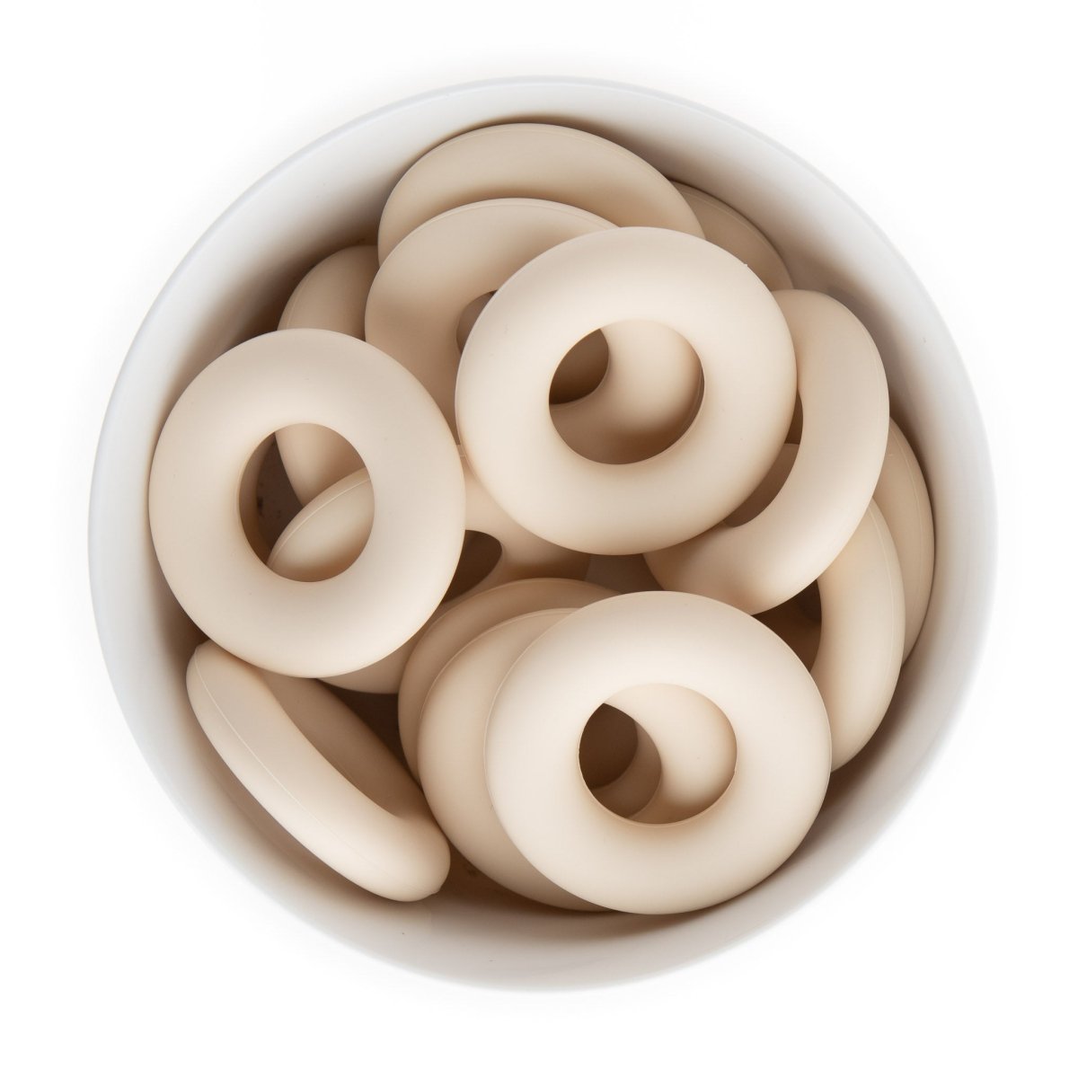 Silicone donut (doughnut) rings/pendants are 44mm in diameter and come in over 20+ colors including tie dye and confetti.